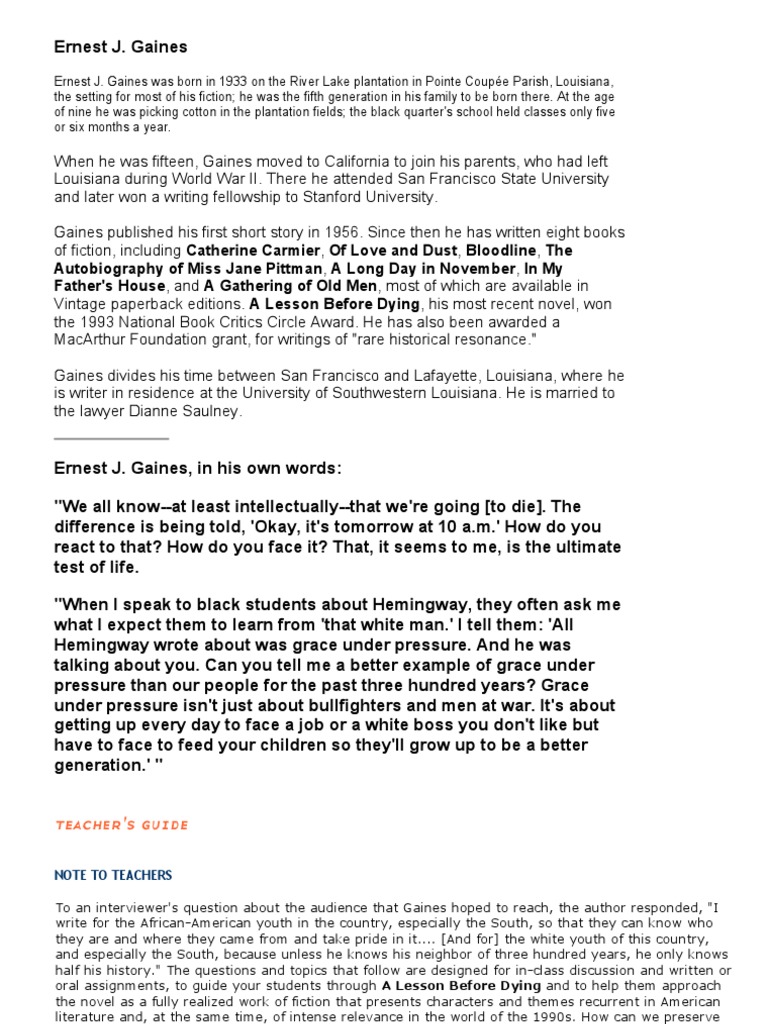 A Lesson Before Dying Chapter 1 - Yeah, it's not clear to. Ask him does christmas come before or after the fourth of july?. Ask him to name the months of the year. Grant narrates the chapter as if. Web a lesson before dying ernest j. Web a lesson before dying is a novel by ernest j. Web set in the fictional community of bayonne, louisiana, in the late 1940s, a lesson before dying tells the story of jefferson, a twenty. Web a lesson before dying even after he had gone to await the jurors' verdict, her eyes remained in that one direction. Web a lesson before dying ernest j. Gaines that was first published in 1993.