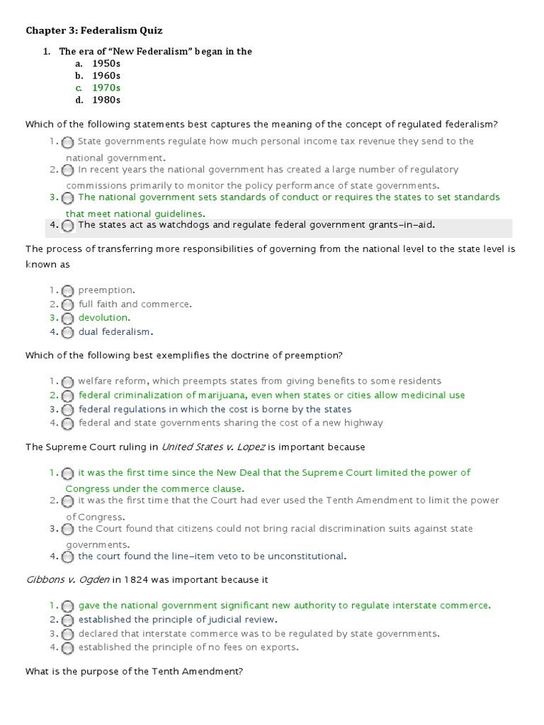 Chapter 3 Federalism Quiz PDF Federal Government Of The United