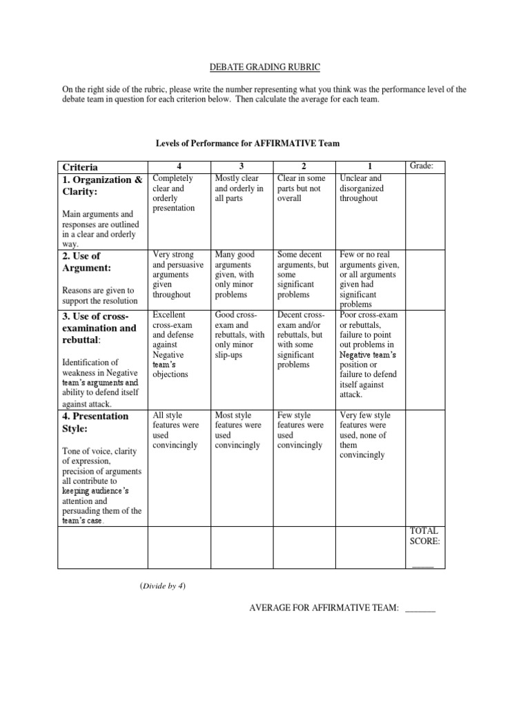 This table can be used to judge the quality and techniques other debaters are using to convey their points. For each measurable criteria give marks for the speakers level of. Scoring sheet for rubric for evaluating debate performance Web you've reached the end of another grading period, and what could be more daunting than the task of composing insightful, original,.