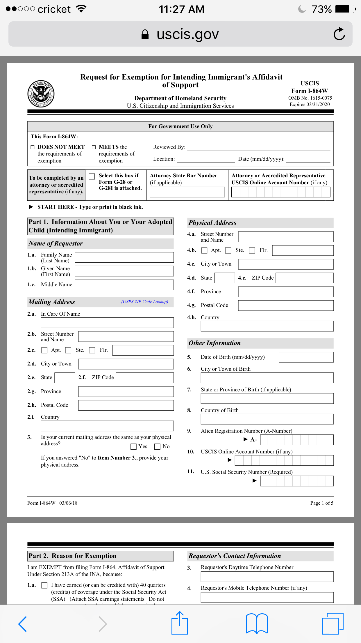 Download Instructions for USCIS Form I864W Request for Exemption for