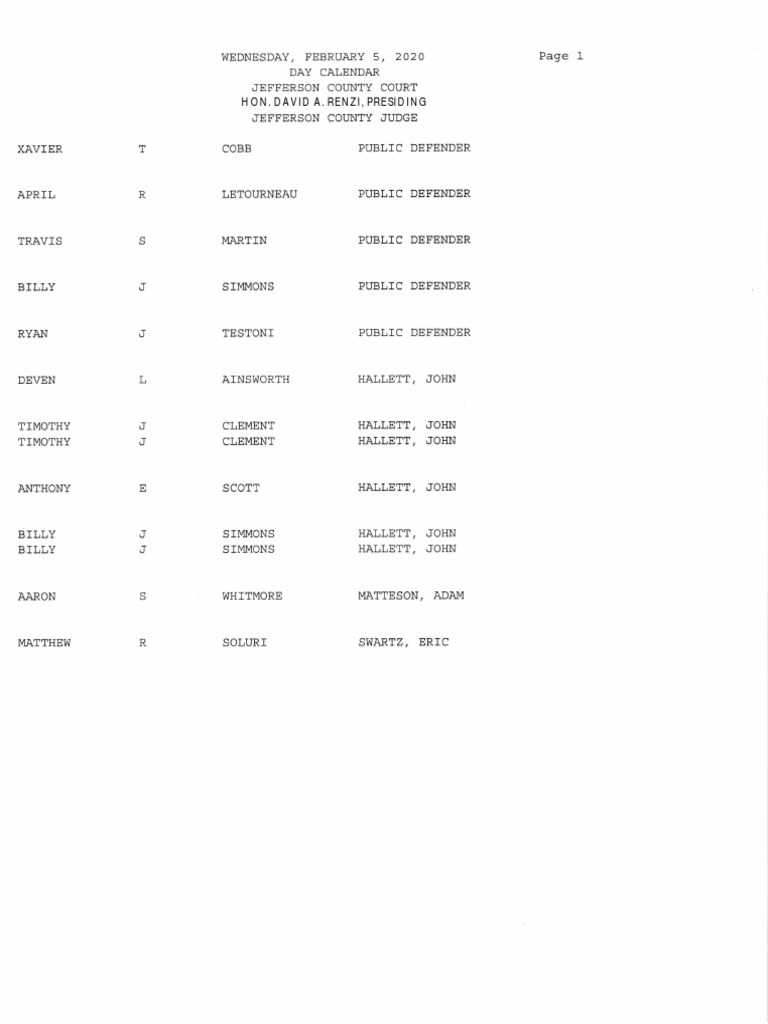 Jefferson County Court calendar Feb. 5, 2020