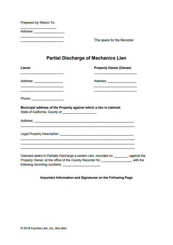 California Partial Discharge of Mechanics Lien Form Free