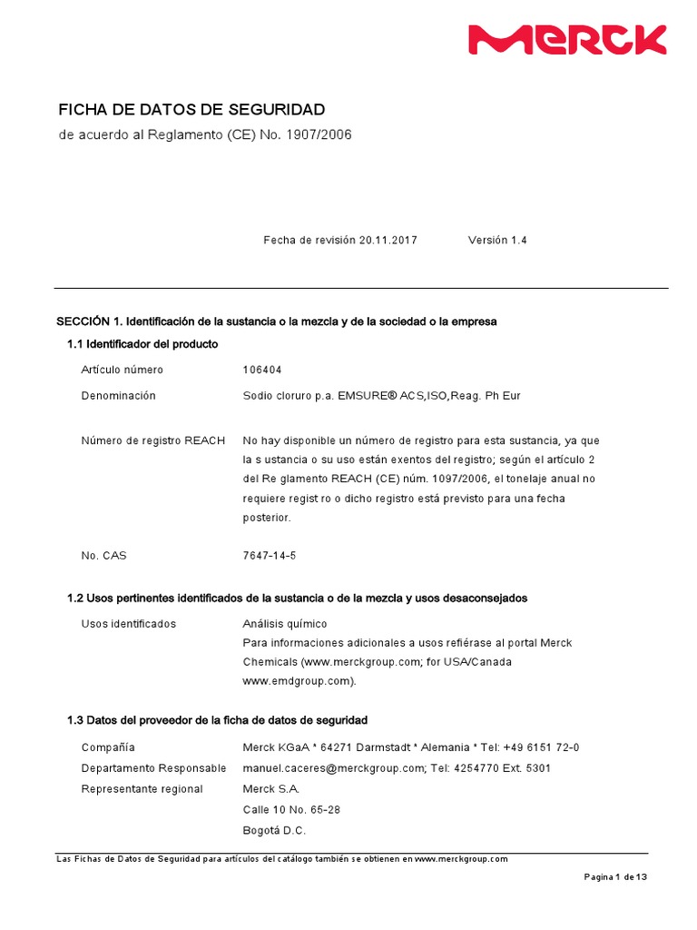 MSDS Reactivo NaCl Toxicidad Agua