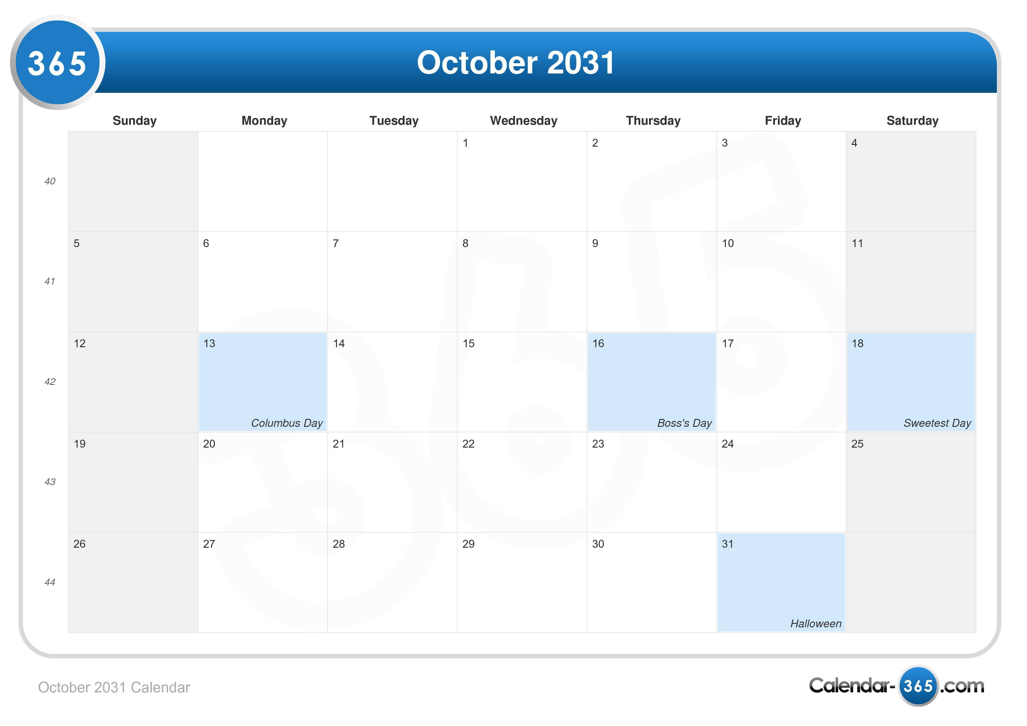 Web find out the dates and names of holidays and celebrations in the united states of america for october 2031. View online or print in pdf format. Web celebrating the fabric of our lives thursday, october 9, 2031 world post day delivering connections, bridging distances friday,. Doesn't get easier than that. Web october 2031 calendar contains us holidays sun mon.