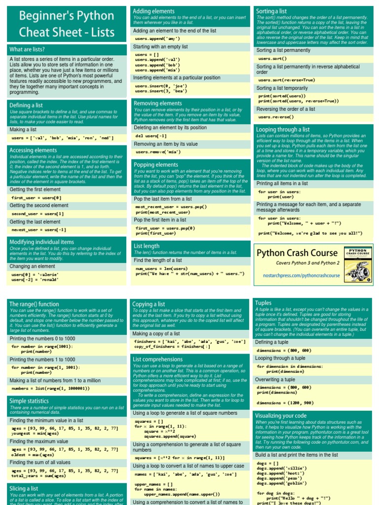 Beginners Python Cheat Sheet PCC Lists PDF Areas Of Computer