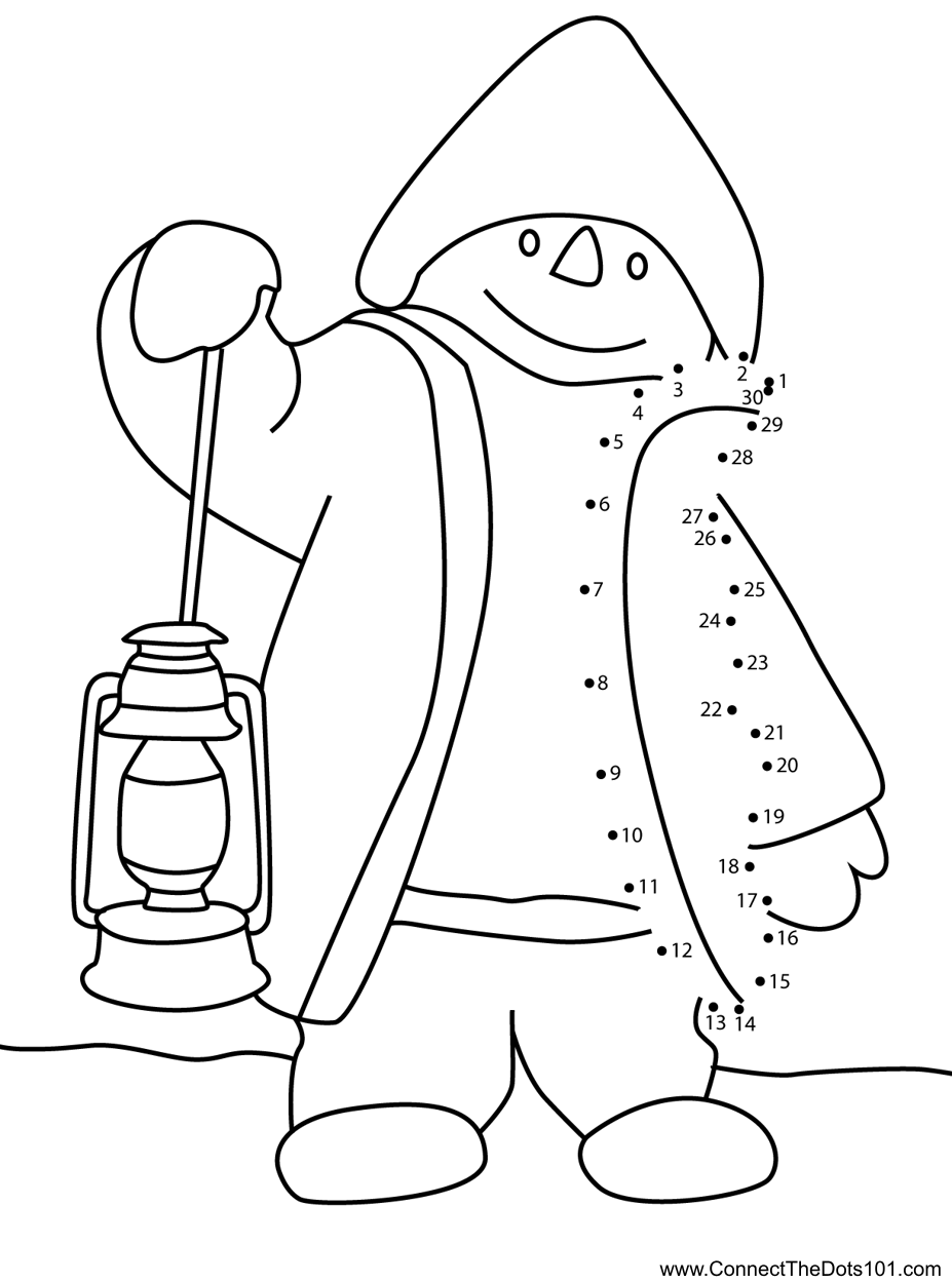Snowman With Lamp dot to dot printable worksheet Connect The Dots
